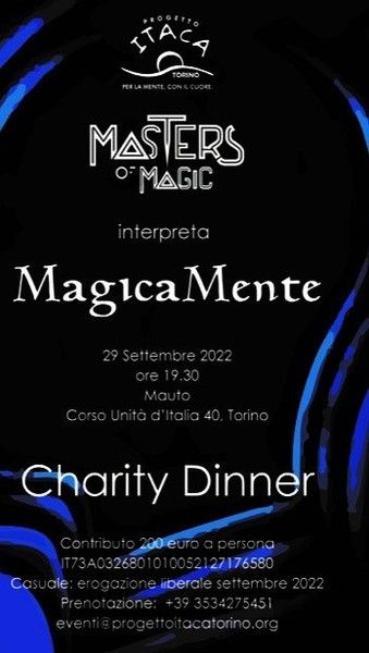 La serata prevede un Welcome Cocktail seguito dalla cena placée in tavoli da 10, lo spettacolo "MagicaMente" e un'asta di opere di Artisti Piemontesi.