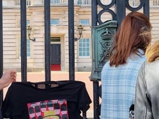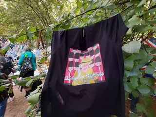 Silvio e la compagna Maria Lucia per l'occasione hanno portato anche quattro magliette con la scritta "Goodbye Queen", deposte a Buckingham Palace e a Green Park.