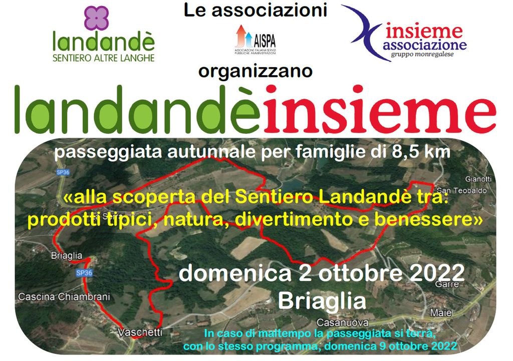 Comincia la stagione autunnale dell’Associazione Insieme con un’iniziativa organizzata dal gruppo della zona del Monregalese, in stretta collaborazione con il Comitato del Sentiero Landandé, che si svolgerà domenica 2 ottobre con il prezioso contributo di Banca Alpi Marittime. “LANDANDE’ INSIEME. Alla scoperta del Sentiero Landandé tra prodotti tipici, natura, divertimento e benessere” è un evento rivolto principalmente alle famiglie, per far riscoprire lo stile di vita sano tramite il contatto con la natura, il consumo di prodotti del territorio, i momenti di convivialità, di confronto e di rilassamento mentale.