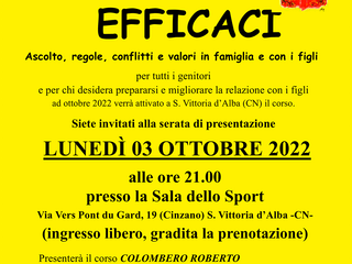 Lunedì 03 ottobre 2022, alle ore 21,00 presso la Sala dello Sport a Cinzano di S. Vittoria d’Alba, in via Vers Pont du Gard n. 19, si terrà una serata di presentazione del corso di formazione “Genitori Efficaci”.