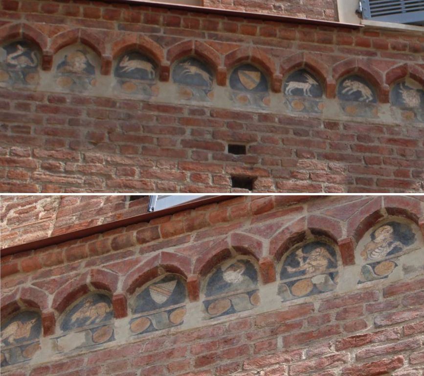 "L'aspetto più interessante che emerso dopo i restauri - prosegue Mamino - riguarda i dipinti: nella cornice più bassa la successione, dallo spigolo a valle al portale seicentesco, è quasi interamente conservata, con 20 sottarchi decorati con soggetti che possiamo identificare così: testa virile, stemma, piccolo drago, testa di giovane, lepre che salta, levriero che salta, stemma, cane che salta, testa, cinghiale, stemma, figurazione fallica, animale quadrupede con grande testa, animale bipede con criniera, animale bipede con due teste, stemma, donna bendata che gioca a "mosca cieca", suonatore di corno, suonatore di liuto. Poi due frammenti illeggibili a ridosso del portale seicentesco. Le rappresentazioni sono a forte caratterizzazione naturalistica e i soggetti sono ricorrenti; volendo raggrupparli abbiamo: stemmi, teste virili, animali fantastici, suonatori e due raffigurazioni erotiche. Il fondo dei disegni è costantemente nero fumo mentre le figure prediligono il bianco calce."