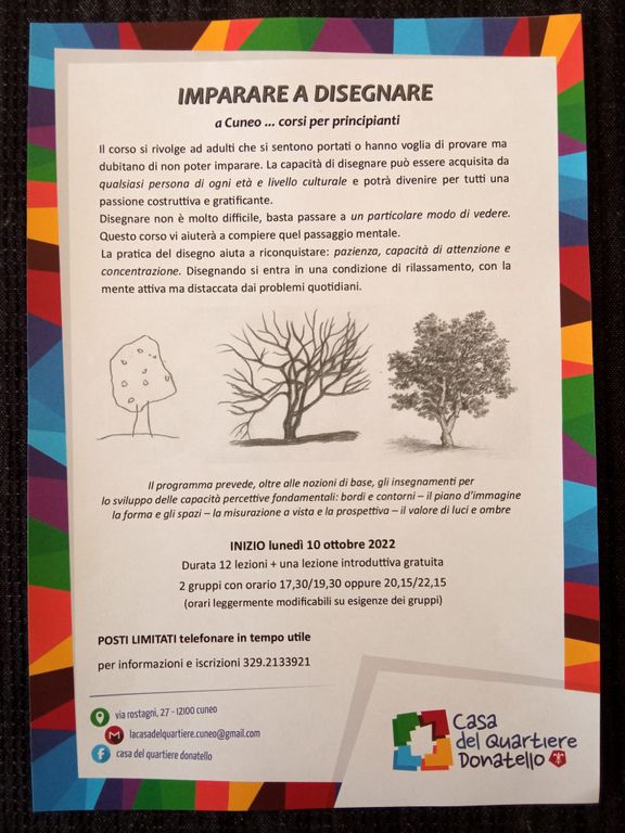 Il corso “Imparare a disegnare” si rivolge ad adulti che si sentono portati o semplicemente attratti dal disegno. La capacità di disegnare può essere acquisita da qualsiasi persona di ogni età e livello culturale e potrà divenire una passione gratificante.