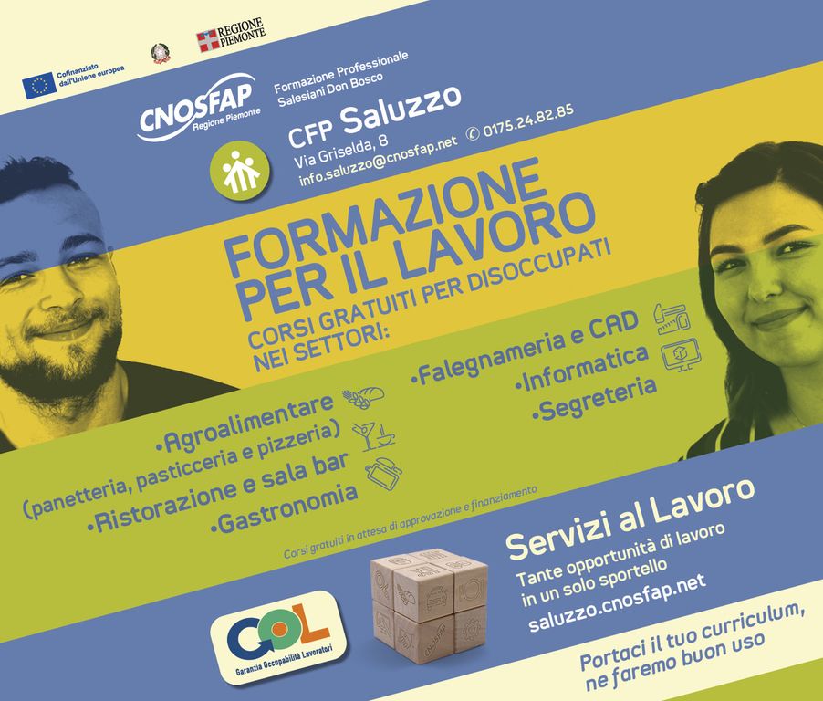 Alla sede di Saluzzo del CNOS Fap, la formazione professionale salesiana, sono aperte le iscrizioni ai corsi di qualifica, riqualifica ed aggiornamento per adulti (maggiorenni), occupati e disoccupati. La formazione è gratuita perché finanziata da Regione Piemonte, FSE plus e da quest’anno anche dal programma GOL: per questo motivo chiediamo di contattare la sede per avere le informazioni necessarie per l’inserimento nei corsi, ma abbiamo anche una maggior libertà di scelta nelle tipologie di corso che possiamo attivare.