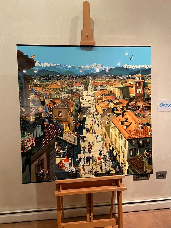 E' stata svelata questo pomeriggio, venerdì 7 ottobre, la personale di Pierpaolo Rovero Imagine All The People. Città, colori e punti di vista e, in particolare, l'opera Cuneo bogia nen che l’artista torinese ha realizzato ad hoc per l'edizione 2022 del "Festival dei Luoghi Comuni".