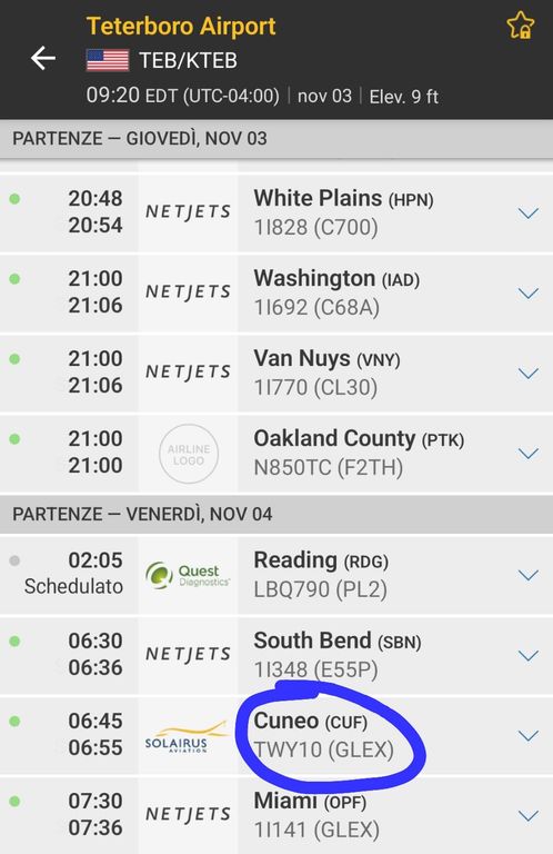 Destinazione Cuneo Levaldigi, dove l'arrivo del jet è previsto alle 19. Come riportato da Wikipedia, l'aeroporto si trova nel New Jersey Meadowlands a 29 km da Midtown Manhattan.