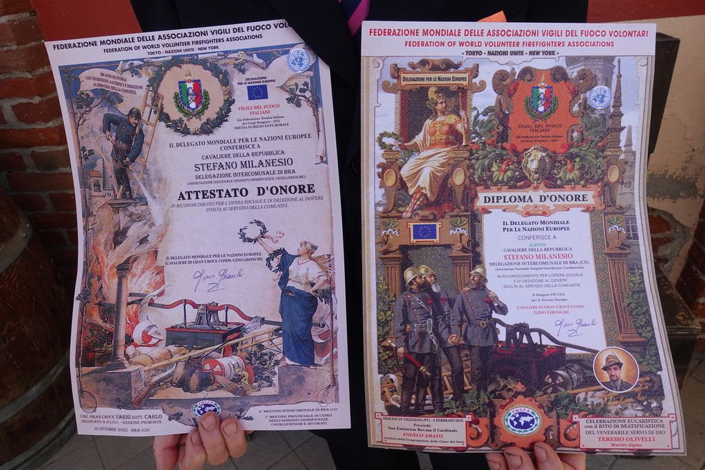 Due diplomi d’onore, inviati dalla Federazione Mondiale delle Associazioni Vigili del Fuoco Volontari, sono giunti a Bra in segno di “Riconoscimento - recitano le pergamene - per l’opera sociale e di dedizione al dovere svolta al servizio della comunità”.