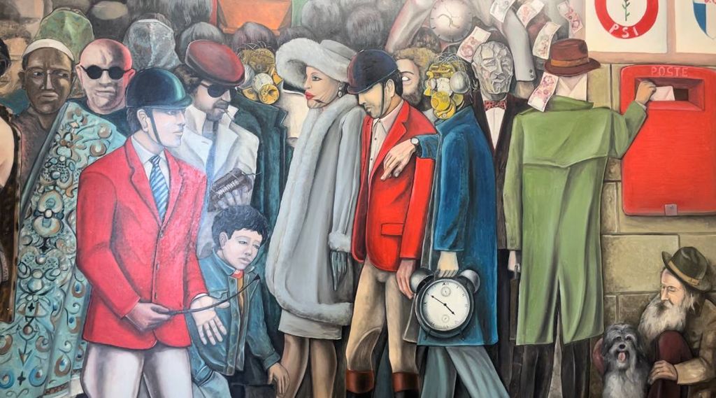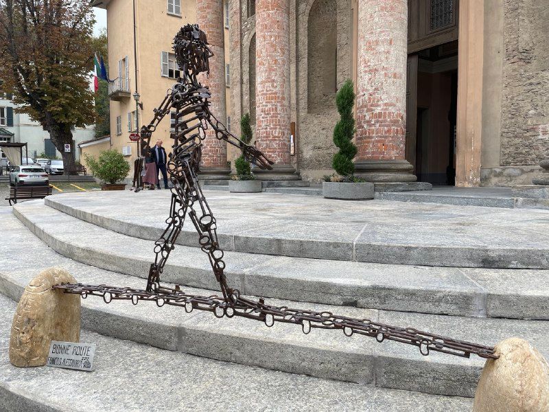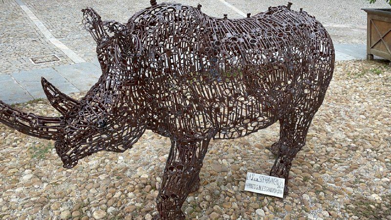 Poi, qualche settimana fa, sono passata a Dogliani ed ecco, sulla piazza della chiesa, alcune delle sue opere (che saranno esposte ancora per tutto il periodo natalizio, ndr): una piccola mostra en plein air, circondata da bambini e famiglie che osservano e si fotografavano con un rinoceronte fatto di chiavi antiche, cui si affiancano figure a dimensione umana che invitano a riflettere sul tempo e sulla vita.
