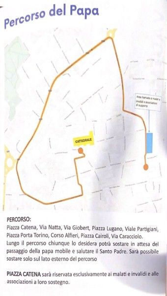 Il Santo Padre alloggerà in Vescovado (dove, fino a giovedì, sarà possibile portare messaggi e doni a lui rivolti) e domenica effettuerà un percorso di quasi due chilometri “su sua precisa richiesta – ha precisato il vescovo – per poter salutare i tanti fedeli che lo amano”.