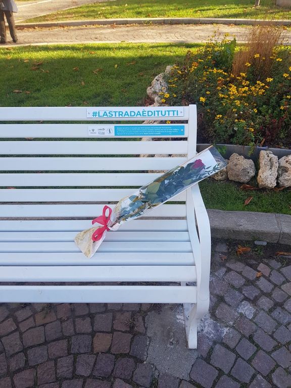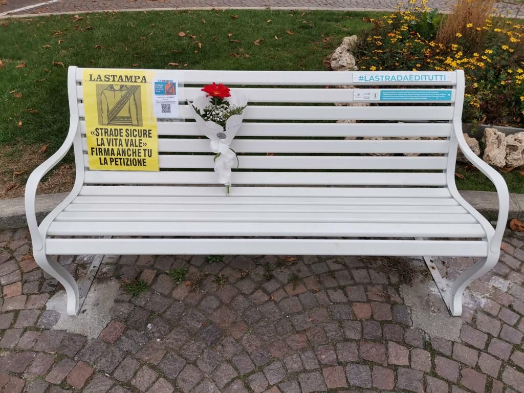 Un fiore rosso come l'amore e il sangue sulla panchina bianca per le vittime della strada inaugurata a Cuneo