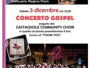 Grande appuntamento con la musica sabato 3 dicembre alle ore 21 al Santuario Regina Pacis di Fontanelle a Boves , con il "Concerto Gospel". Si esibirà la Castagnole Community Choir che, per l'occasione, presenterà il loro nuovo cd "Thank you".