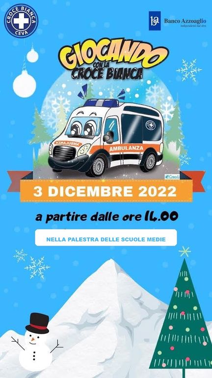 Torna il 3 dicembre a Ceva “Giocando con la Croce Bianca”, il pomeriggio in cui bambini e ragazzi, dalla prima elementare alla terza media, potranno diventare soccorritori per un giorno e utilizzare presidi di soccorso veri, in un percorso tra diverse postazioni. La partecipazione sarà gratuita e ogni partecipante, al termine, riceverà una piccola sorpresa.