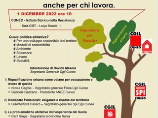 I lavori saranno il prossimo 1 dicembre alle ore 10 con una introduzione del Segretario Generale della CGIL cuneese Davide Masera, proseguiranno con un dibattito sulla “riqualificazione urbana come volano per l'occupazione e lavoro di qualità tra Nicola Gagino Segretario Generale della Fillea CGIL di Cuneo e Gabriele Gazzano Presidente Ance (Associazione Nazionale Costruttori Edili di Confindustria).