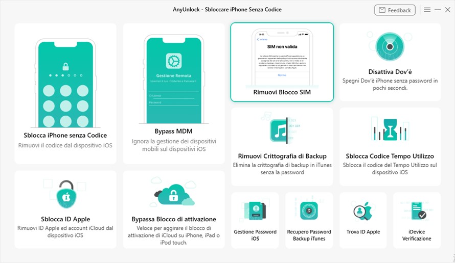 Passaggio 1. Apri AnyUnlock e collega il tuo iPhone al computer tramite USB. Seleziona "Rimuovi Blocco SIM" nell'interfaccia del software.