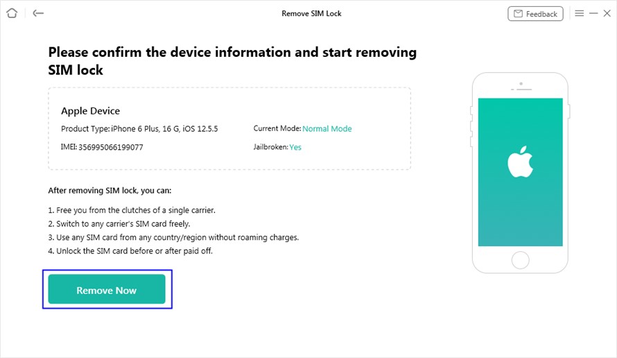 Passaggio 3. Dopo aver completato il jailbreak, fare clic su "Rimuovi ora" in base alle istruzioni dell'interfaccia del software, spegnere il WiFi del telefono cellulare, rimuovere la carta SIM e reinserire lo slot della carta.