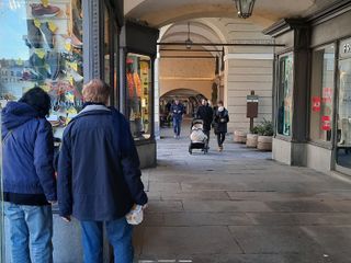 C'è un bel viavai di gente sotto i portici di Cuneo oggi, giovedì 5 gennaio. Sono infatti partiti i saldi invernali che dureranno per otto settimane.