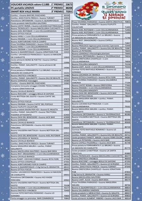 Primo premio al numero 53673, che ha vinto un Voucher vacanza dal valore di 2.000 euro; il numero 88208, invece, si è aggiudicato il secondo premio, con il regalo un computer portatile Lenovo; al 73261 il terzo premio, con in regalo una Smart Box offerta dal Consorzio Turistico Valle Maira.