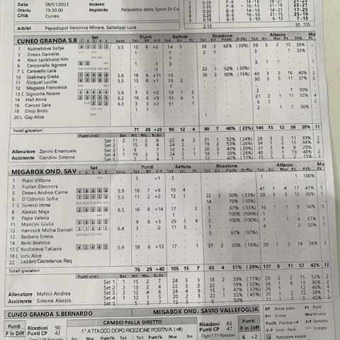 QUARTO SET. Cuneo scappa 5-2 con un attacco di Hall, poi Kutznetsova da posto-4 affonda il colpo del 6-2 ed il tecnico marchigiano è costretto a fermare il gioco. Il copione del set precedente sembra ripetersi quando per Vallefoglia va al servizio Mancini: sulle sue battute arrivano due errori delle piemontesi che rimettono in corsa le avversarie e la Megabox torna sotto 7-6. Poi però Gicquel rimette in moto la macchina da gioco cuneese segnando il punto del 9-6, seguita da Kutznetsova che firma quello del 10-6. Arriva anche l'ace di Signorile e sull'11-6 c'è il secondo time out di Mafrici: le sue ragazze recuperano tre break tornando sotto 16-13. Zanini non vuol rischiare oltre, ferma il gioco e fa bene: muro di Cecconello per il nuovo +5 (18-13), poi l'affondo di Szakmary consentono a Cuneo di scappare 21-15. Sul set ball Zanini (24-19) cambia la diagonale palleggiatore opposto e la neo entrata Diop segna il punto che porta la partita al tie break.