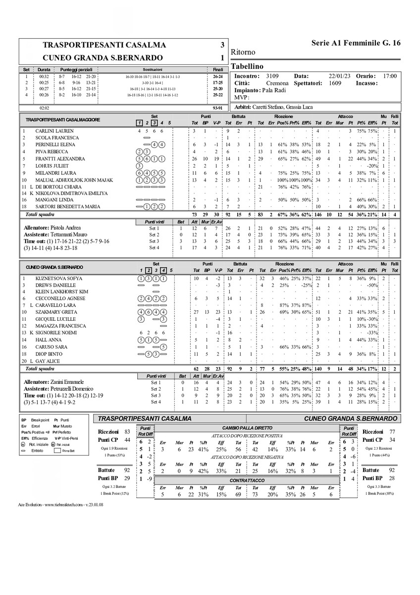 TERZO SET. Il terzo parziale vive invece nel segno di Casalmaggiore. Le lombarde scappano subito 3-0, poi 5-1 con Zanini che interrompe il gioco. Lombarde che aumentano il vantaggio sul 9-5 quando Sartori, che ha sostituito Lohuis, mura Kutznetsova. La russa è richiamata in panchina per far posto all’americana Drews, ma sono ancora le ragazze di Pistola ad andare a break grazie ad un’inarrestabile Frantti che piazza il punto del 13-7. C’è il secondo time out di Zanini: al rientro in campo le sue ragazze appaiono più determinate, provano la rimonta riuscendo a portarsi a due lunghezze dalle avversarie. Un gran muro di Caruso e l’ennesimo attacco di Szakmary fissano il punteggio sul 14-12, ma quando sembra che il loro motore si sia rimesso in marcia arriva l’allungo decisivo delle padrone di casa: il muro su Diop riporta la Trasportipesanti avanti di sei lunghezze (20-16) e a questo punto Zanini prova a cambiare la diagonale palleggiatore opposto richiamando in campo Gicquel e sostituendo Signorile con Klein Lanqvost. Il set però resta saldamente nelle mani di Casalmaggiore, che chiude 25-20 con un attacco di Malual.