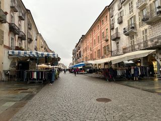 Pochi e sparuti in piazza Galimberti e ancora meno in via Roma. Resistono, perché riparati, quelli sotto i portici della piazza e quelli alimentari del mercato coperto.