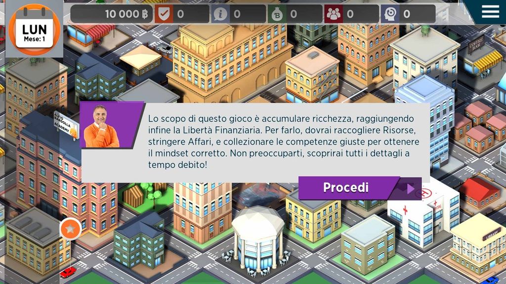 La app è sviluppata in diversi livelli, rappresentati come parti di una città virtuale nella quale è possibile lavorare, stringere affari, investire del denaro, etc. Un errore nelle domande a risposta chiusa non implica la fine del gioco: è infatti possibile effettuare un nuovo tentativo il giorno successivo. Alla fine del gioco, con il raggiungimento della Libertà Finanziaria, è possibile convertire la valuta virtuale in cripto (Ski).