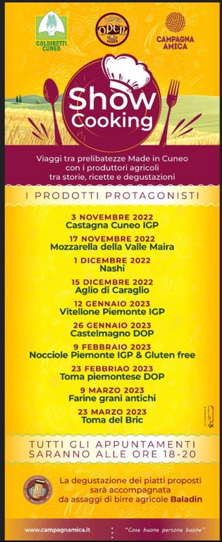Ultimi appuntamenti degli Show cooking all’Open Baladin Cuneo con Coldiretti Campagna Amica. Un intrigante viaggio all’insegna di storie e sapori, fra degustazioni, racconti dei produttori agricoli, curiosità svelate sui prodotti e sulle ricette. La formula resta la stessa delle scorse edizioni: da un'idea di Elio Parola, patron del locale di piazza Foro Boario, l'evento coinvolgerà Coldiretti e il circuito di Campagna Amica, oltre all'Alberghiero di Dronero, che parteciperà con un docente e alcuni studenti nella preparazione delle ricette con il prodotto protagonista della serata.