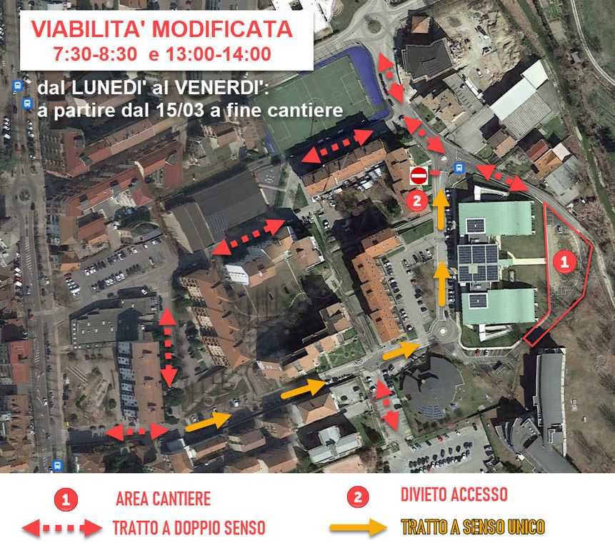 Particolare attenzione viene riservata per limitare i disagi alla circolazione stradale. Per questo motivo viene realizzata una viabilità modificata (nell'immagine sopra), che prevede il senso unico della via Cencio negli orari di ingresso e uscita dalle scuole (dalle 7.30 alle 8.30 e dalle 13 alle 14). Si tratta di una misura sperimentale concordata con la Direzione scolastica, con il Centro Riabilitazione Ferrero e con i residenti della zona.