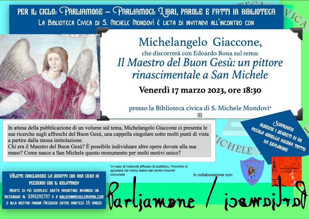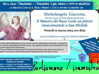 L’incontro di apertura sarà venerdì 17 marzo alle 18.30 con lo storico dell’arte Michelangelo Giaccone, in dialogo con con Edoardo Bona, consigliere con delega alla cultura e direttore responsabile della Biblioteca civica sul tema:'Il Maestro del Buon Gesù: un pittore rinascimentale a San Michele'.