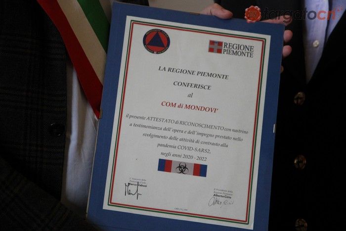 "Un gesto per dire grazie - ha detto il sindaco di Mondovì, Luca Robaldo, dopo aver proiettato il messaggio del presidente della Regione Piemonte, Alberto Cirio - per tutto l’impegno che avete messo in campo sacrificando il vostro tempo libero per mettervi a disposizione della comunità. La giornata di oggi, 18 marzo, è una data che non abbiamo scelto a caso. La cerimonia volevamo fosse oggi perché ricorre la giornata in memoria delle vittime della pandemia. Un pensiero e un grazie lo rivolgiamo anche all'ex sindaco Paolo Adriano per tutte le energie spese nel corso del suo mandato per affrontare le difficoltà dell'emergenza pandemica. Guardiamo al passato per ricordare ciò che è stato, un momento necessario e doveroso".
