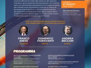 Al loro fianco le istituzioni, a partire dal CONI, rappresentato da Stefano Mossino, presidente Piemonte, e Claudia Martin, delegato provinciale. I lavori verranno introdotti da Marta Serrano Valenzuela, fondatrice e presidente di Sport Innovation Hub, il primo centro italiano per l’innovazione che ha l’obiettivo di diffondere lo sport come strumento per generare un impatto economico e sociale nel territorio. Si proseguirà con ‘I numeri dello Sport’ presentati da Roberta De Sanctis, docente di Macroeconomia e International Economics del LUISS Lab of European Economics. ‘L’innovazione nello sport’ verrà esposta da Federico Stroppiana, vicepresidente Gruppo Mondo, azienda nata ad Alba nel 1948 come produttore di palloni per la pallapugno. In 70 anni di storia è diventata un Gruppo internazionale con 9 stabilimenti produttivi in Italia, Spagna, Lussemburgo e Cina e consociate di vendita in Europa, Nord America e Asia. L’azienda è composta da tre divisioni: Mondo Sports Flooring, Artigo e Mondo Toys. Ognuna di esse racchiude l’eccellenza del proprio settore di competenza: pavimentazioni e attrezzature sportive, pavimentazioni civili, palloni e giocattoli. Il tema della “Digitalizzazione e della comunicazione nello sport” verrà affrontato da Alessandro Gino, pilota e general manager della Gino Spa, concessionaria attiva nel mondo automotive dal 1959. “L’onda lunga dei grandi eventi sportivi” sarà oggetto dell’analisi autorevole di Marco Martinasso, direttore generale della FITP, protagonista in Piemonte con l’organizzazione pluriennale delle Nitto ATP Finals. “Lo sport per la comunità” sarà al centro dell’intervento di Piero Battaglia, presidente del CRAL Michelin Sport Club, realtà associativa nata nel 1967, strutturato in 13 sezioni sportive e ricreative dedicate a tutti, dipendenti e non: oggi conta 2300 soci. “Dalle sponsorizzazioni sportive alla responsabilità sociale d'impresa” il titolo dell’intervento di Gianpiero Vietto, global manager del “Kinder Joy of moving”, il progetto di Responsabilità Sociale del Gruppo Ferrero che intende portare la gioia del movimento nella vita di ogni bambino.
