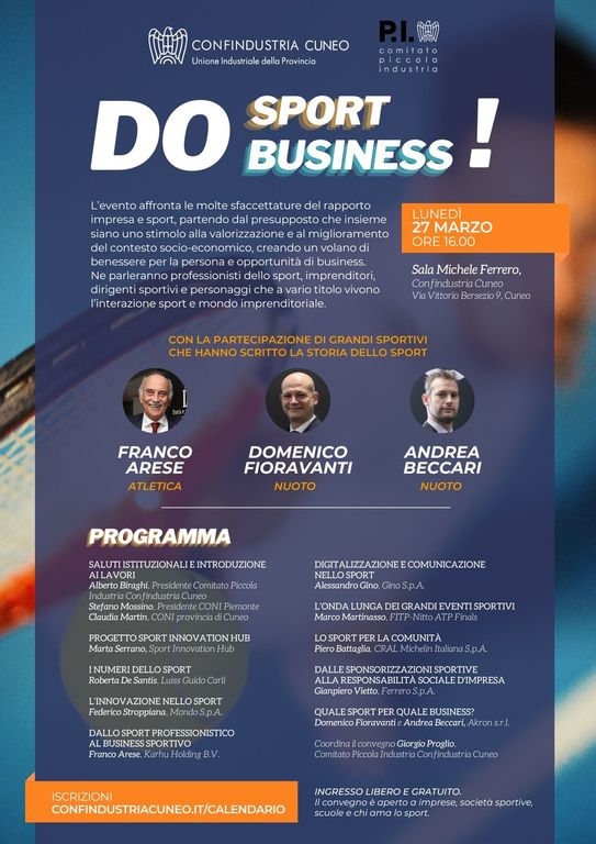 Come si può implementare il dialogo tra impresa e sport? Quali sono i giusti mezzi per creare un volano di benessere per la persona e coltivare le opportunità di business? Sono queste le due domande che il Comitato della Piccola Industria di Confindustria Cuneo ha deciso di porre al centro del convegno “Do Sport, Do Business!”, in programma lunedì 27 marzo alle ore 16.00 in Sala Michele Ferrero. Il made in Italy esprime vere e proprie eccellenze nella produzione di articoli sportivi con imprese che si sono affermate sui mercati esteri grazie ad un livello altissimo di qualità, design e tecnologia. Con oltre 15 mila imprese nel settore della gestione di impianti e attività sportive, un fatturato diretto di oltre 4 miliardi di euro e quasi 40 mila lavoratori impiegati, lo sport, oltre a essere un settore industriale strategico per l’economia nazionale, riveste un ruolo sociale di grande rilevanza, generando significativi effetti positivi immateriali per il Sistema Paese, come il miglioramento del benessere psicofisico della popolazione e della coesione sociale, la riduzione della spesa sanitaria, la promozione del territorio e del turismo, concorrendo sotto diversi aspetti alla realizzazione degli obiettivi di sviluppo sostenibile dell’Agenda ONU 2030.