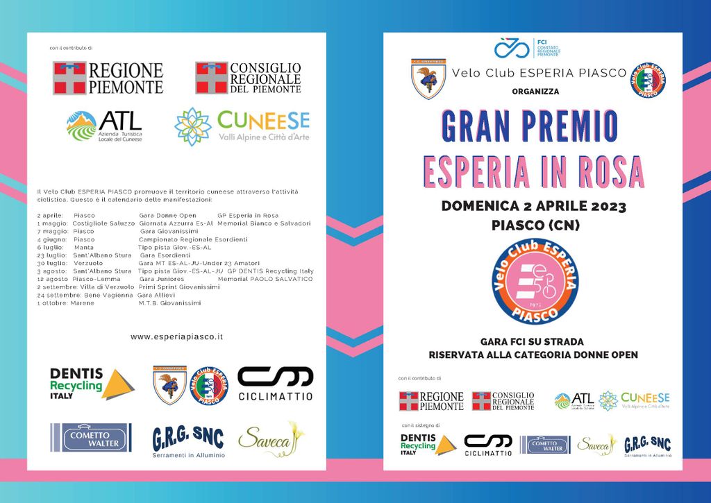 Domenica 2 aprile si terrà, per la prima volta, il GRAN PREMIO ESPERIA IN ROSA, gara dedicata alle donne open e juniores. Piasco vuole confermarsi come capitale del ciclismo giovanile piemontese e proporrà il classico circuito della colletta di Busca alternato al circuito di Villanovetta-Costigliole Saluzzo. L’arrivo sarà nel centro abitato, nella zona di Sant’Antonio, teatro già della classica per esordienti.