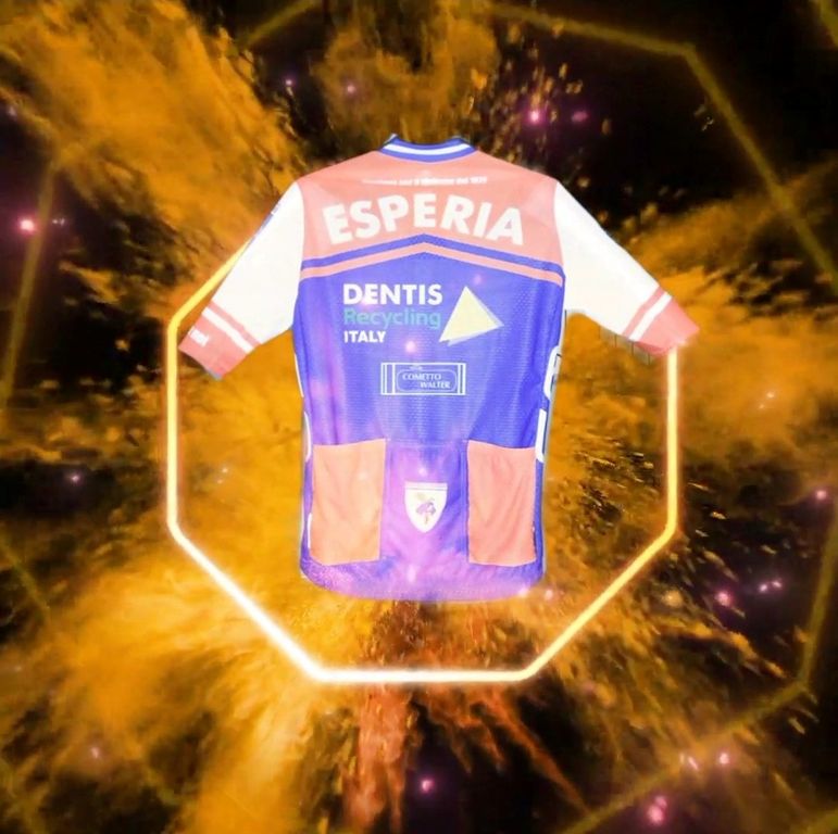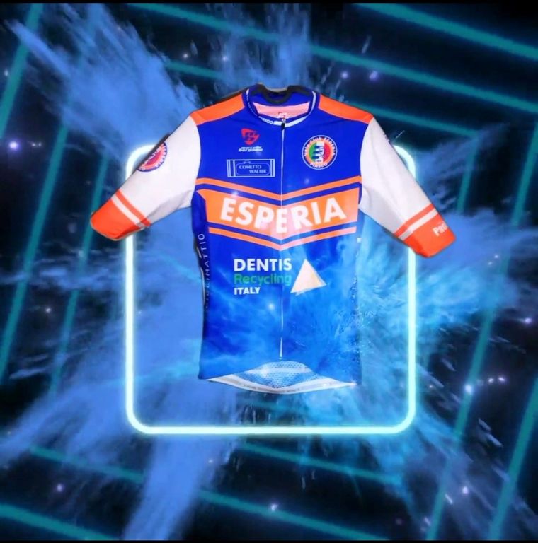 Sul retro la parte arancione diventa una freccia per esser bene visibile agli automobilisti durante gli allenamenti ed aumentare la sicurezza degli atleti che la indossano. Alla brillantezza dell’arancio fluo fa da sfondo il blu vivo sul quale spiccano i nomi degli sponsor che sostengono il progetto: DENTIS RECYCLIGN ITALY, WALTER COMETTO- SPURGHI, CICLI MATTIO, MARCELLO BERGAMO.