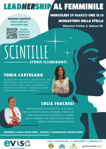 "Leadhership" al femminile. Il primo appuntamento, fissato per il 29 marzo alle 18.15 presso il Monastero della Stella a Saluzzo, è dedicato al tema della leadership femminile e avrà come protagoniste Tonia Cartolano, giornalista di Sky Tg24 e autrice del libro Leadhers - storie di donne straordinariamente normali, e Lucia Fracassi, Direttore operativo di eVISO. L'evento sarà moderato da Laura Boglione, Coach e Counselor Supervisor, e aperto dalle ballerine della scuola di danza MOVE Divertirsi Ballando, che interpreteranno alcune coreografie tratte dallo spettacolo “RIBELLI. Donne che hanno rivoluzionato il mondo”. Grazie alla collaborazione con la libreria Mondadori Bookstore di Saluzzo a fine evento sarà possibile acquistare il libro dell’autrice.