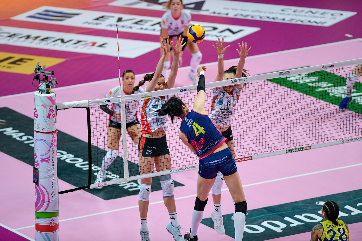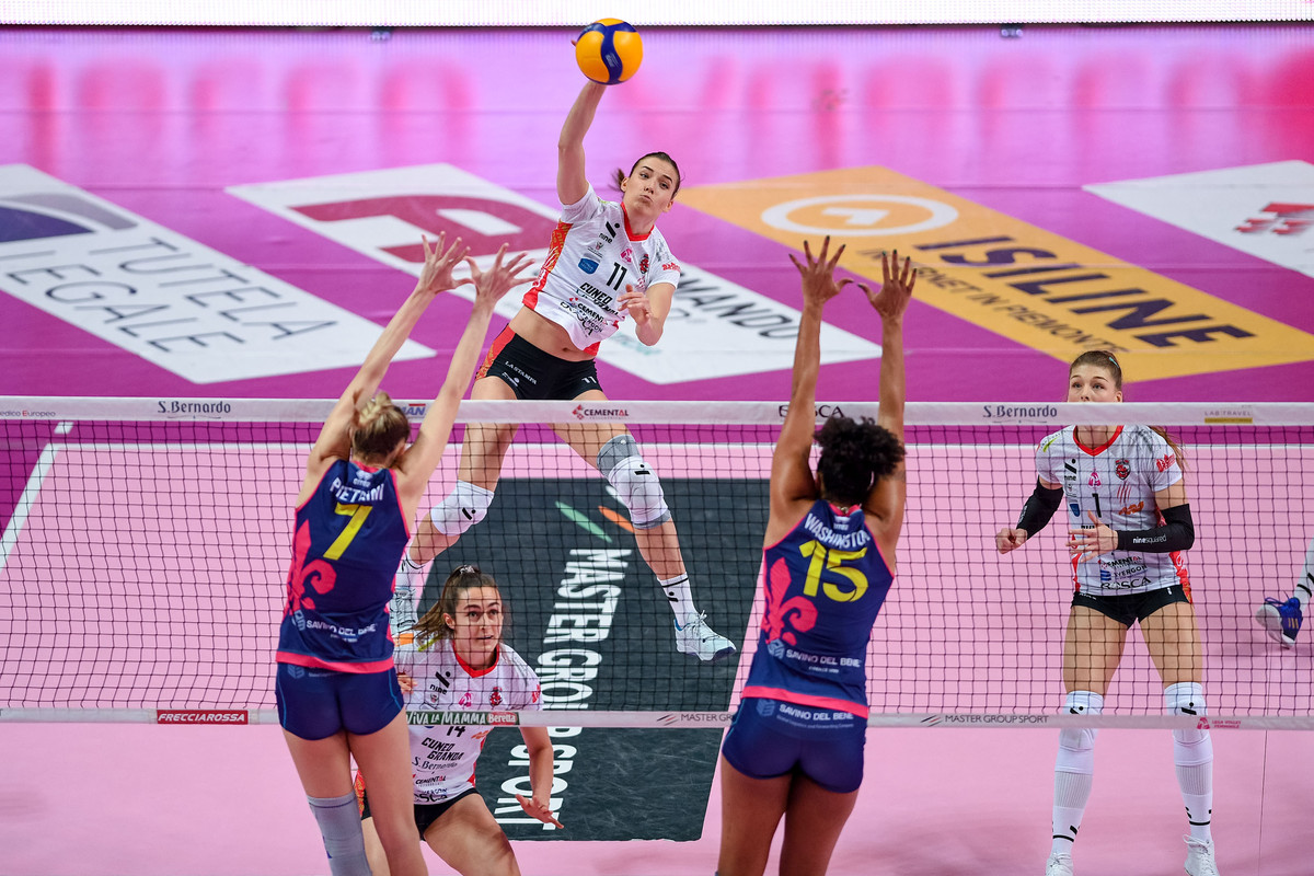 TERZO SET. Un errore in attacco di Kutznetsova ed il tap in di Zhu portano Scandicci avanti 1-4 sulla rotazione al servizio di Alberti. Le toscane incrementano il loro vantaggio con due aces consecutivi di Di Iulio su Kutznetsova e Bellano è costretto a fermare il gioco con le ospiti avanti 5-10. time out che non sortisce effetto perché al rientro in campo un fallo di posizione fischiato a Cuneo ed il muro di Antropova su Szakhmary portano Scandicci avanti 5-12. L'allenatore biancorosso cambia l'ungherese con Drews, le sue ragazze recuperano un paio di break e sul -4 (13-17) Barbolini stoppa il gioco. Pausa salutare per Scandicci, che con Pietrini in attacco e l'ace di Washington torna avanti 13-20 prima di chiudere 17-25 con un muro di Zhu su Diop.