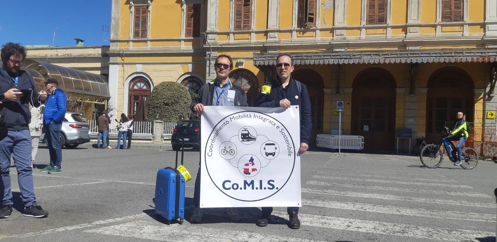 Cartellone bene il vista del Co.Mi.S ( Coordinamento Mobilità integrata e sostenibile) con il presidente e vicepresidente, per sostenere la riattivazione della linea Saluzzo-Savigliano.