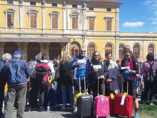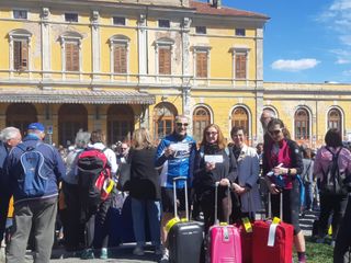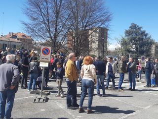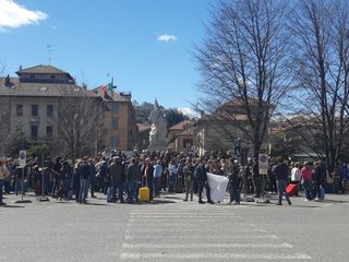 Un piazzale affollatissimo per una richiesta sentita da tutto il territorio: “Rivogliamo il treno”, che si espressa con grande partecipazione e colore, oggi sabato 1° aprile. “E non è uno scherzo”, dicono le fascette adesive attaccate alle valigie.