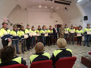 Per l’Ana fossanese l’attestato al presidente Maurizio Castelli e ai volontari Guglielmo Barge, Claudio Bosio, Franco Bosio, Claudio Ciola, Giovanni Gerbaudo, Maurizio Giraudo, Giuseppe Giuffrida, Francesco Manassero, Luciano Monasterolo, Adriano Paschetta e Giuseppe Prato.