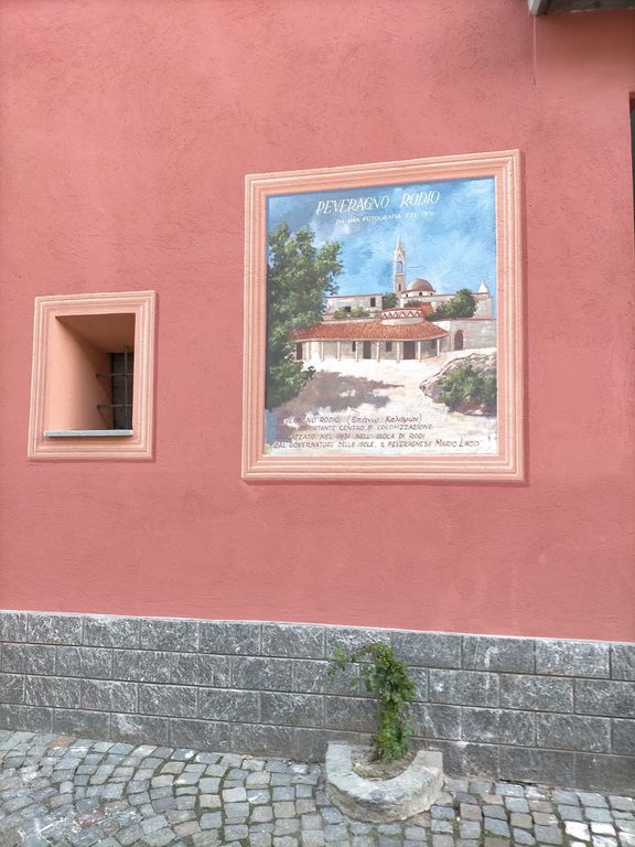 Sul muro del civico 15 di via Guglielmo Abate infatti - abitazione di Angelo Demaria - Renaudi ha dipinto un'immagine da Peveragno Rodio, centro abitato greco realizzato nel 1931 nell'isola di Rodi che prende il nome proprio dal paesino ai piedi della Bisalta per celebrare l'allora governatore Mario Lago, di lì originario.