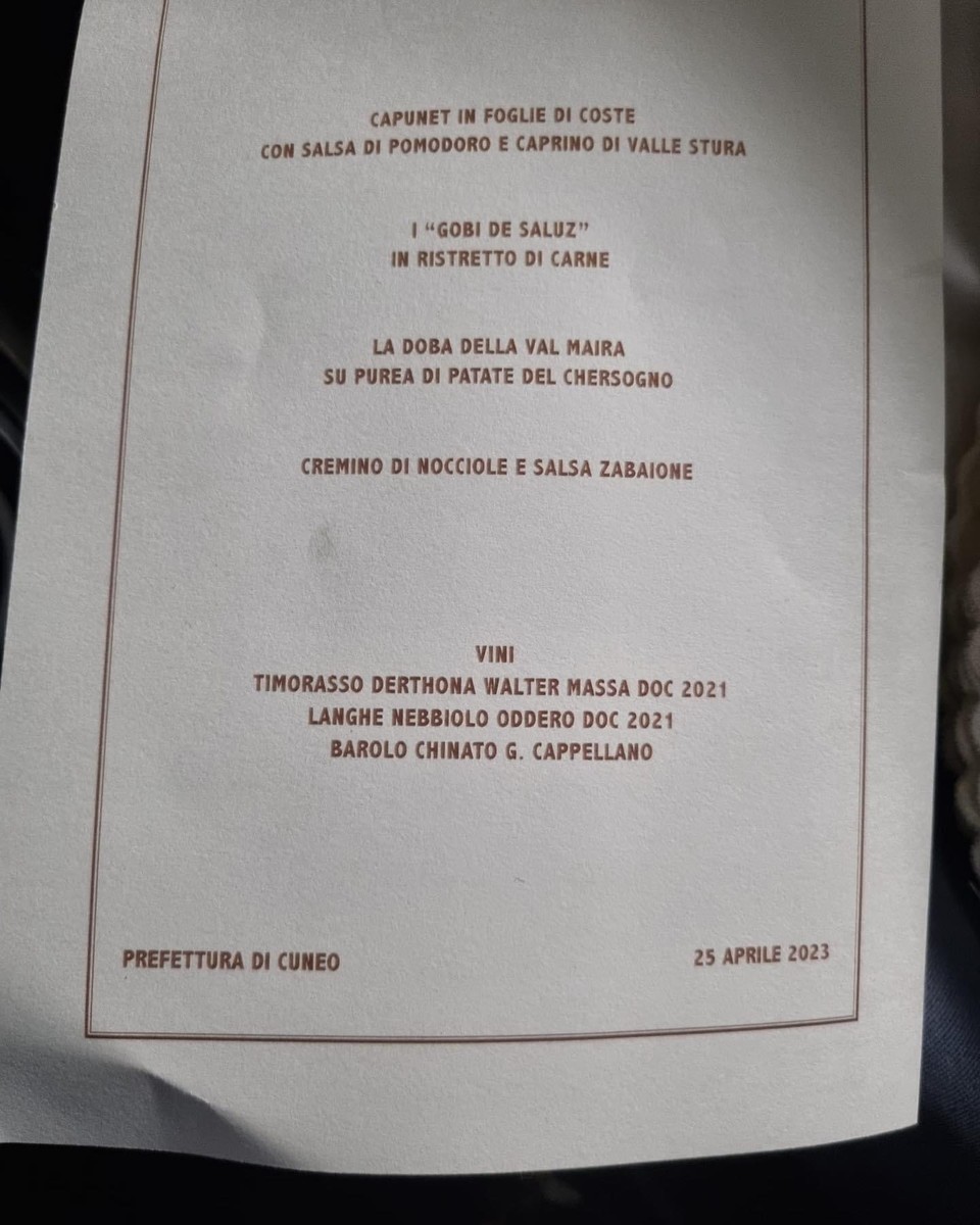 Il menù scelto ha visto come antipasto i capunet in foglie di coste con salsa di pomodoro e caprino della valle Stura e come primo i ‘Gobi’ di Saluz in ristretto di carne. La ‘Doba’ della val Maira su purea di patate del Chersogno il secondo, che ha portato i commensali al dolce, ovvero il cremino di nocciole e salsa zabaione. Nei calici, Timorasso Derthona di Walter Massa (20219), Langhe Nebbiolo Oddero de La Morra (2021) e Barolo Chinato di Giuseppe Cappellano.