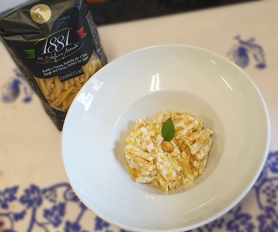 5 Saltate la pasta nella padella con la salsa; impiattate completando con la granella di nocciola e un filo di miele allo zafferano.