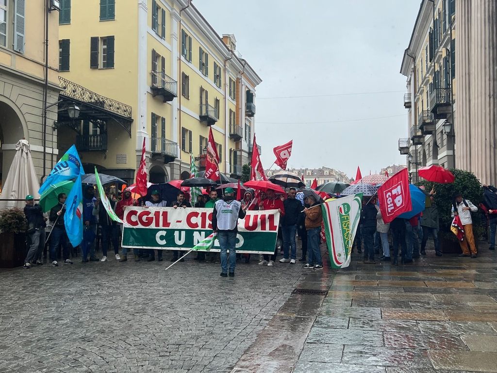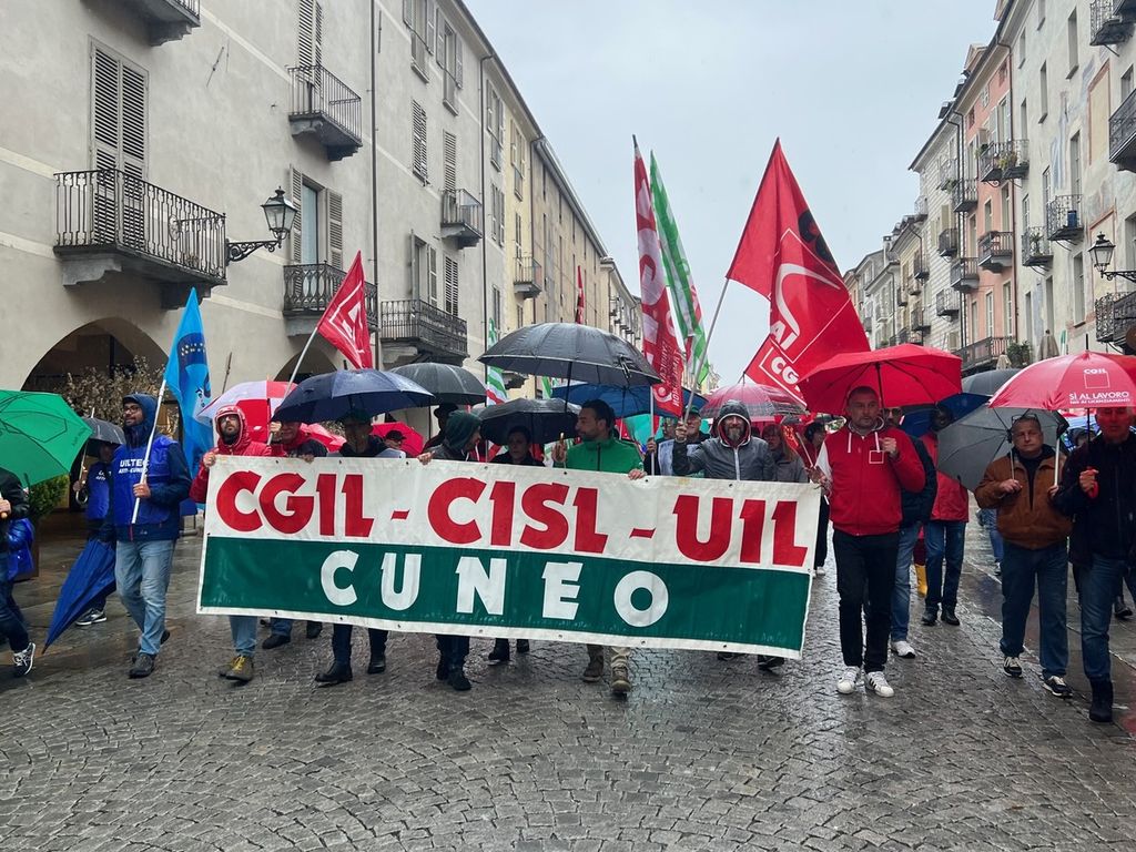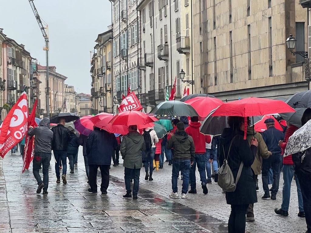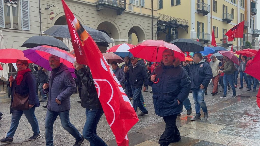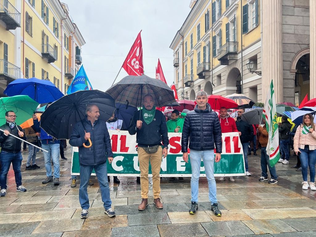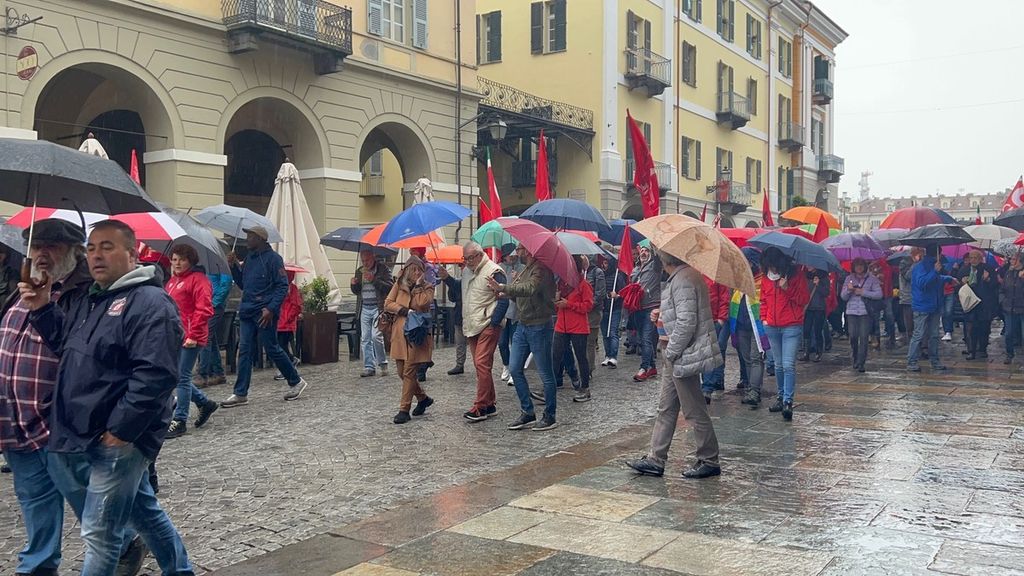 La pioggia non ha fermato la Festa dei lavoratori, che si è svolta questa mattina a Cuneo. In quattrocento hanno sfilato in via Roma, con destinazione piazza Virginio, dove è stato allestito il palco per gli interventi.