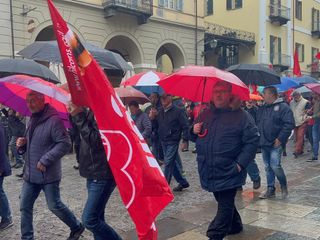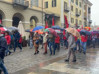 La pioggia non ha fermato la Festa dei lavoratori, che si è svolta questa mattina a Cuneo. In quattrocento hanno sfilato in via Roma, con destinazione piazza Virginio, dove è stato allestito il palco per gli interventi.
