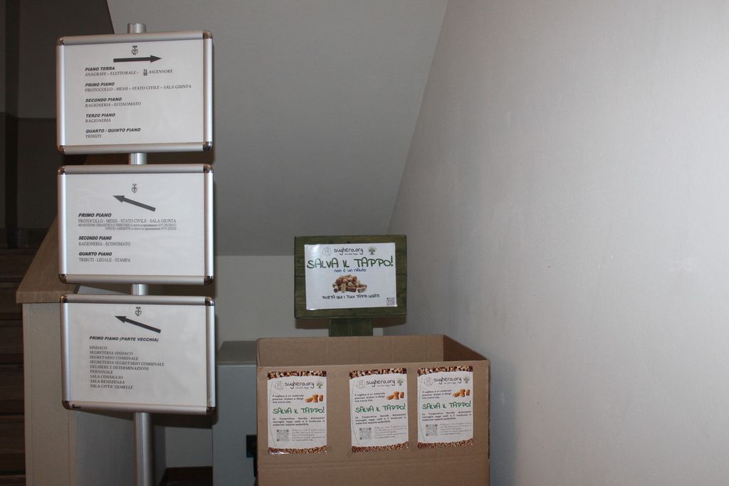 Al piano terra del Municipio, nei pressi del contenitore per la raccolta dei tappi in sughero, si trova anche il contenitore blu per la raccolta dei tappi di plastica.