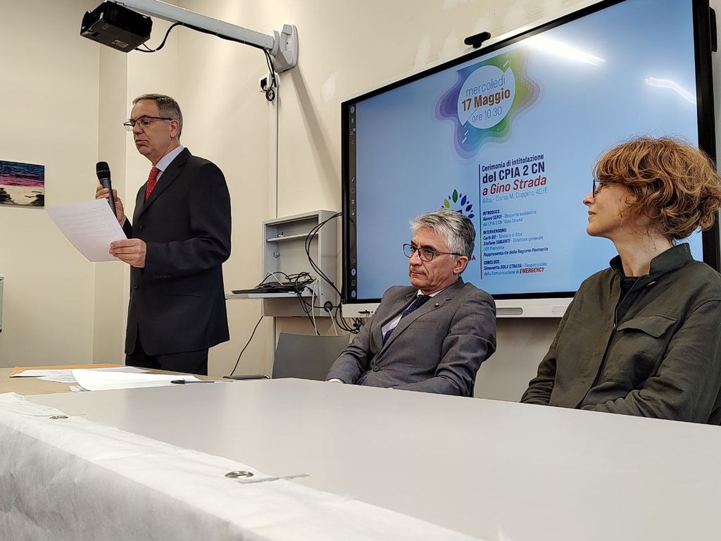 All’intitolazione odierna sono intervenuti il dirigente del CPIA, professor Gianni Sergi, il sindaco di Alba Carlo Bo, il sindaco di Bra Giovanni Fogliato e Simonetta Gola Strada, accompagnata da una delegazione locale di Emergency.