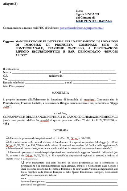 Inoltre, deve essere indicato il possesso dei requisiti richiesti, l'attestazione di aver preso visione del capitolato e l'indirizzo Pec per le comunicazioni, secondo il modello allegato sulla pagina Facebook di ‘Pontechianale’ (che trovate qui al fondo) e al seguente link: