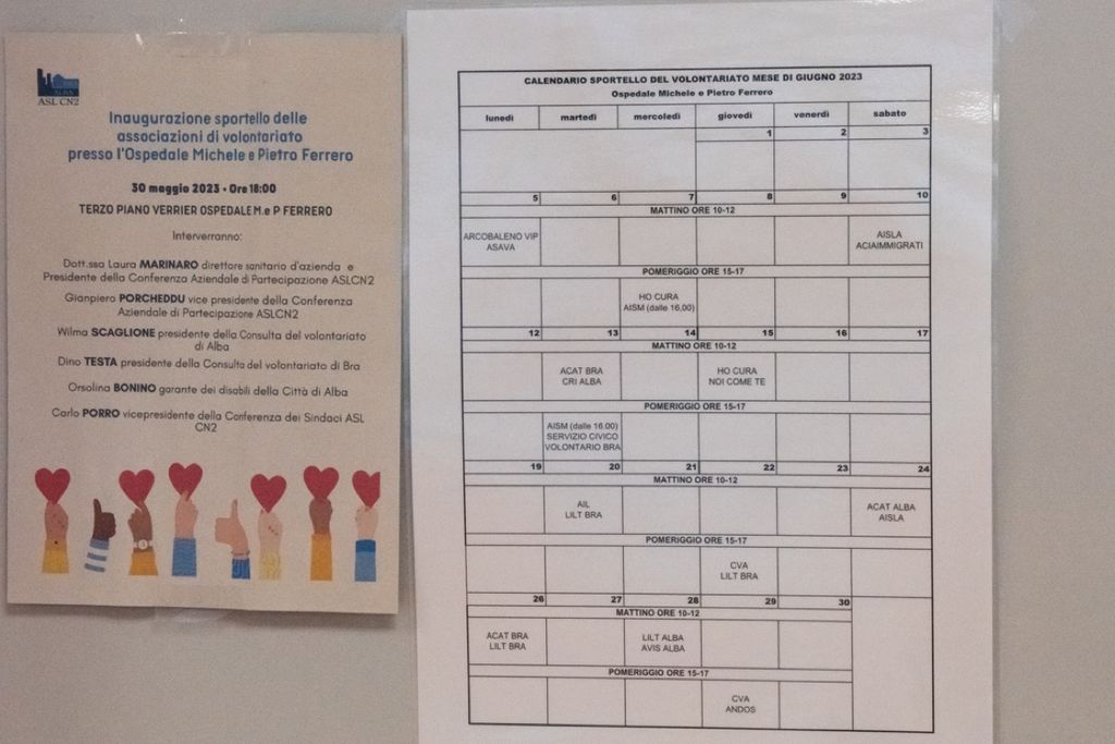 Aprirà ufficialmente la sua porta da giugno, lo Sportello del Volontariato, con sede all’interno dell’ospedale Michele e Pietro Ferrero di Verduno, un’iniziativa che permetterà agli utenti del nosocomio e non solo di entrare più facilmente in contatto con le realtà del terzo settore del territorio e conoscere i servizi che possono offrire.