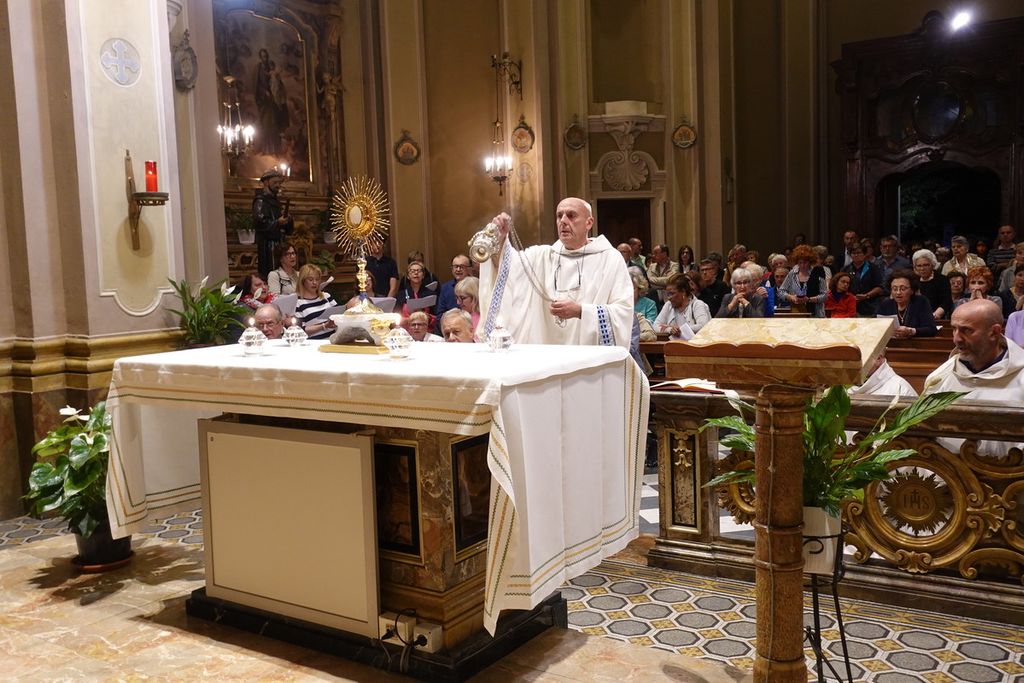 La Santa Messa presso il Santuario della Madonna dei Fiori è stata presieduta da don Gilberto Garrone, insieme al clero locale. «Oggi camminiamo nella fede per l’infinita fame e sete di comunione, nutrita dal vero pane che è Cristo. Amare l’Eucaristia è amare l’umanità». Così il parroco di San Giovanni di fronte alla vasta assemblea. Tra i banchi anche il gruppo Alpini e le Confraternite dei Battuti Bianchi e dei Battuti Neri, presenti con i rispettivi stendardi.