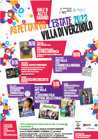 Il programma prevede giovedì sera risate e comicità con la “Mezz’ora Canonica” con Filippo Bessone e Luca Occelli, il venerdì per la prima volta sul palco della Villa la band piemontese I Farinedi D’la Brigna con lo spettacolo V.I.P, il sabato il gradito e richiestissimo ritorno della band gli Acustica e si concluderà la domenica con l’affermato Folk Festival delle Corali Piemontesi presentato da Sonia De Castelli e con le canzoni delle Mondine, I Giuvu D’na Volta e Veronica Cuneo.