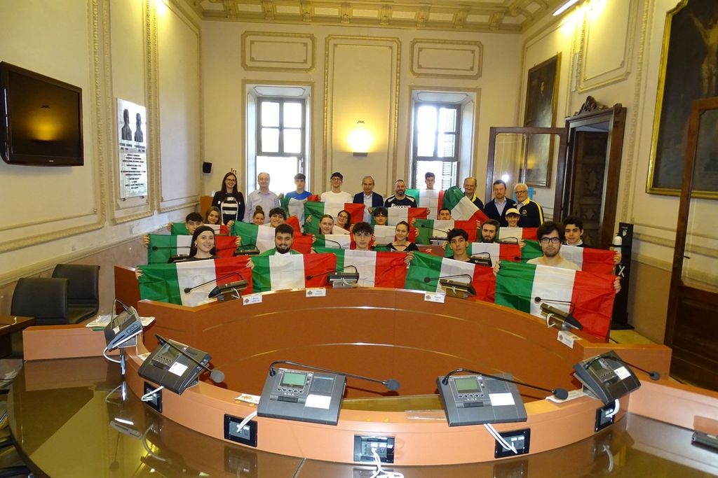Al termine, foto di gruppo nell’aula consiliare del Municipio con la nostra bandiera nazionale in bella vista. Tre colori e un cuore solo.