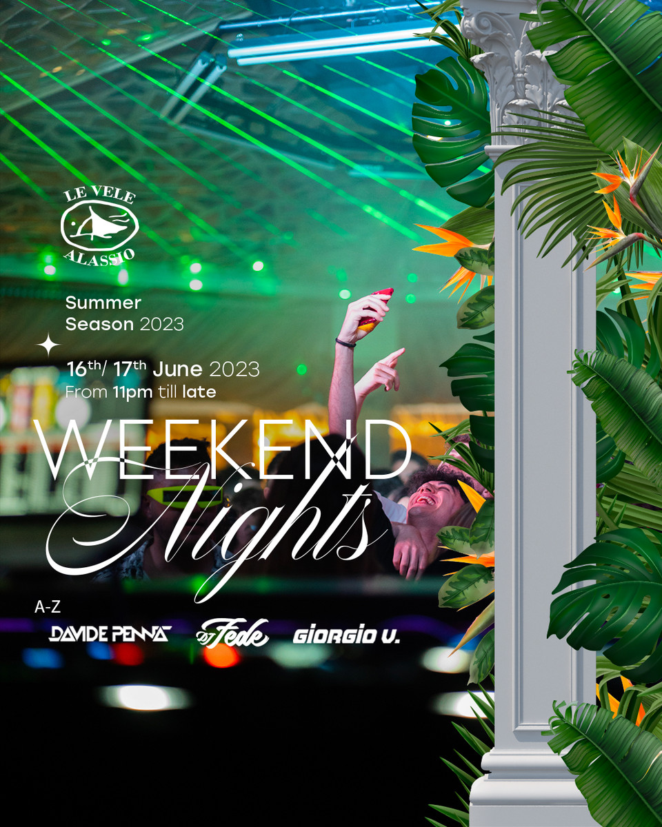 Venerdì 16 e sabato 17 non mancherà il weekend più esclusivo dell'estate: il magico "Weekend Nights"! La tipologia musicale delle serate è open format: troverete in consolle al venerdì DJ Fede, mentre al sabato Davide Penna, entrambi accompagnati dal nostro dj resident Giorgio V. che da oltre 20 anni fa ballare Le Vele Alassio.